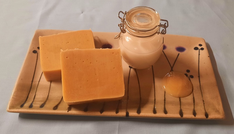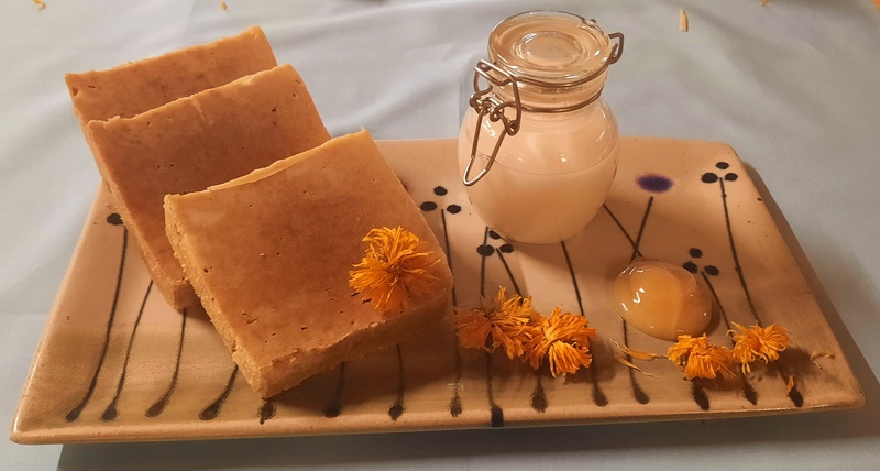 Briquette Ô Calendula : Beurre de Karité, Lait de chèvre, Macérat de Calendula sur huile de Tournesol Oléique , macérât de Calendula sur huile d' Amande douce, huile de Coco, huile de Ricin, Miel. Sur-gras 8%