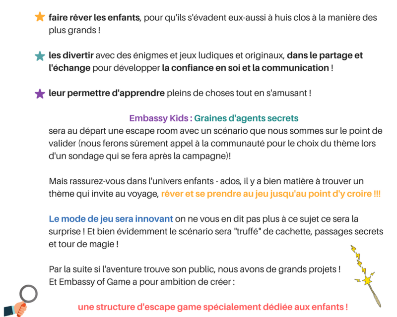 Les joueurs (parents, enfants...) nous l'ont demandé et Embassy of Game souhaite proposer cette aventure exclusive et décalée pour que les enfants de 6 à 12 ans aient leur propre escape game : Embassy Kids Graines d'agents secrets !