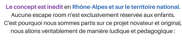Créer la première salle de Savoie entièrement dédiée aux enfants. Cette expérience sera unique aussi bien dans les décors, que les costumes, que l'univers de jeu proposé.