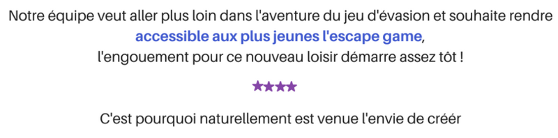 Dès l'ouverture de l'escape room, une nouvelle recrue viendra compléter l'équipe en CDI temps partiel puis à terme temps plein.