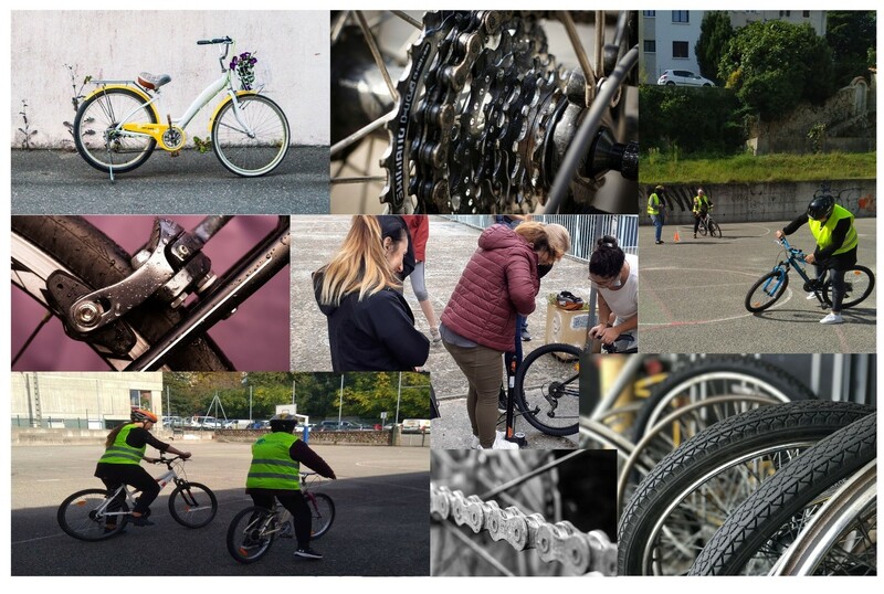 Photos des actions déjà réalisées par Mobilité 07-26 depuis 3 ans en lien avec le vélo. Illustration du type de vélo nécessaire à tou-te-s et du matériel adéquat.